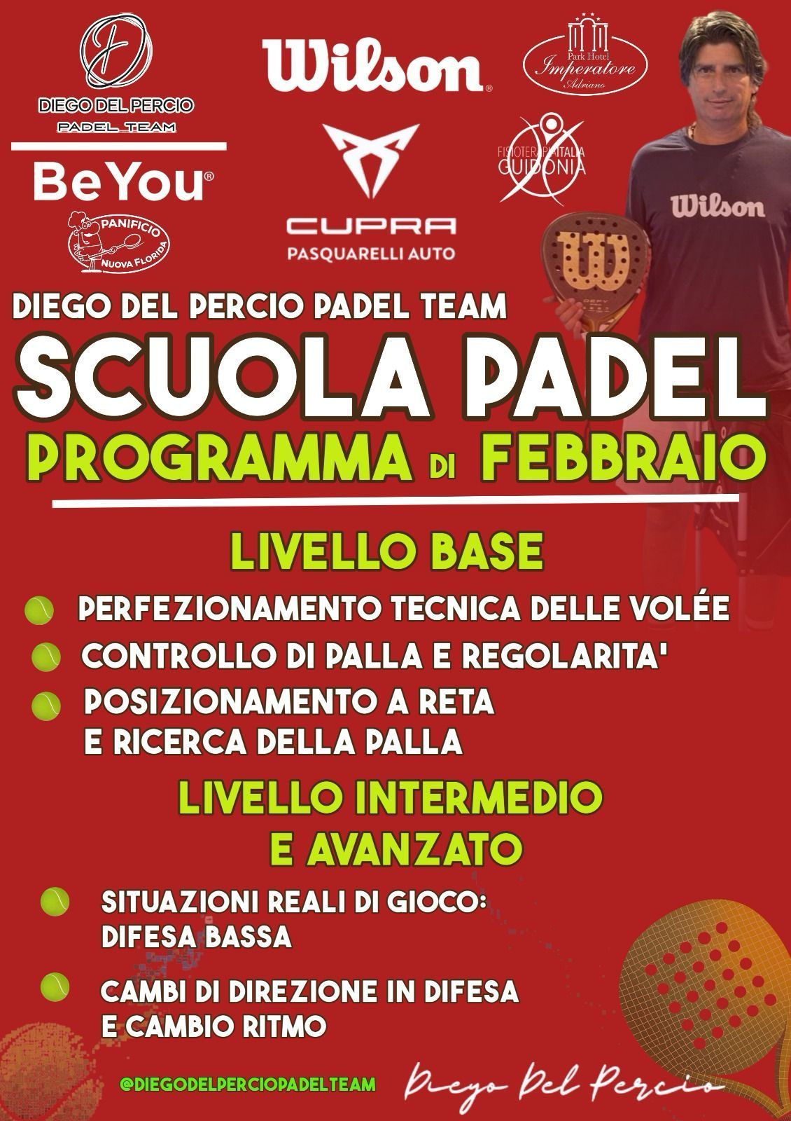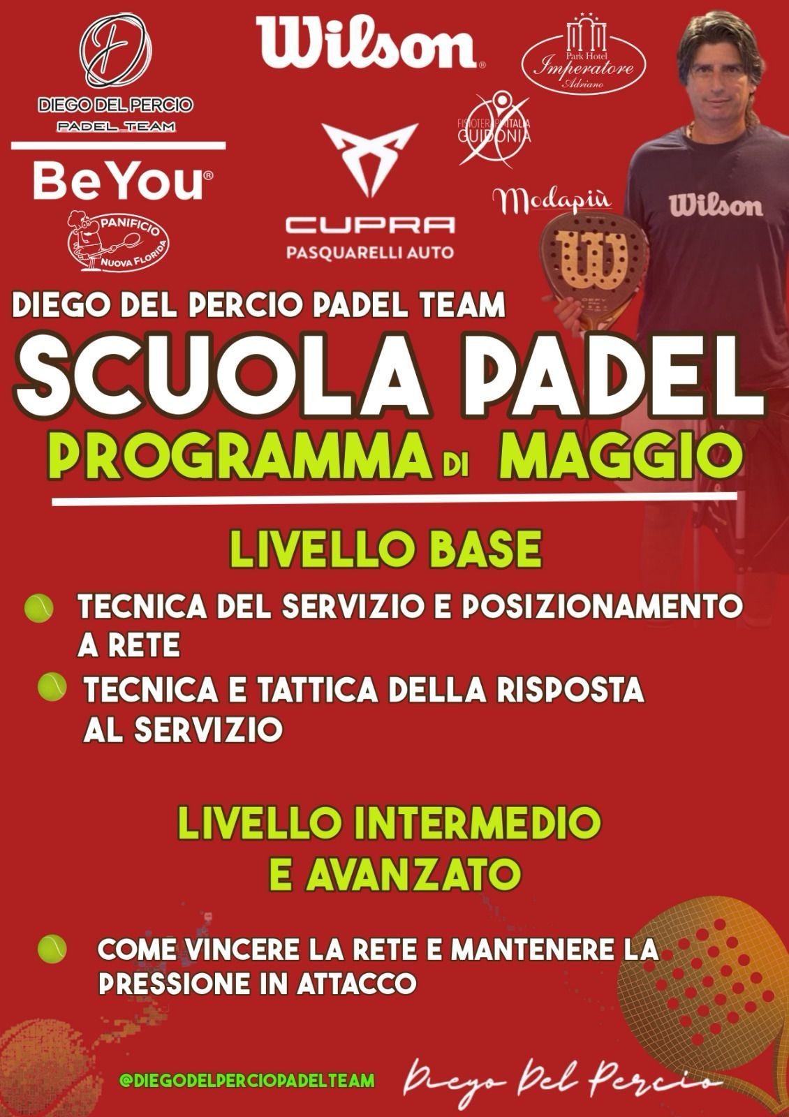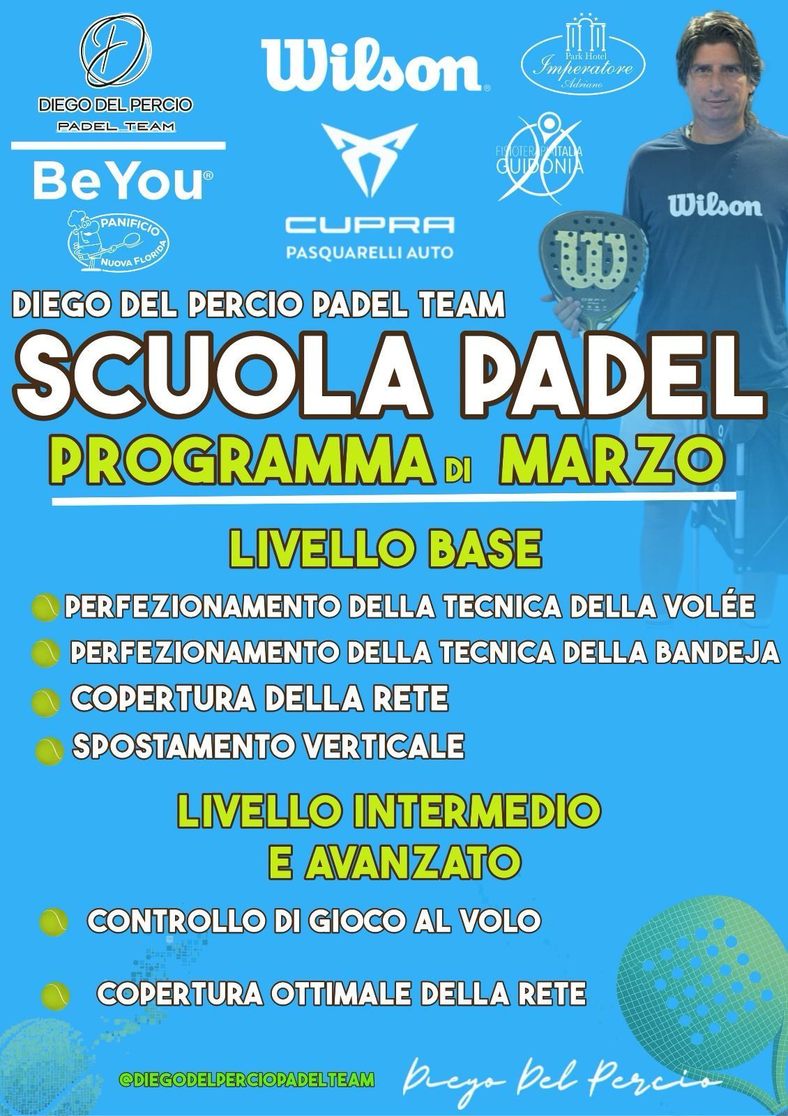 Presso il Diego del Percio Padel Team, offrendo sessioni di allenamento individuale e di gruppo una vasta gamma di programmi di formazione personalizzati adatti a giocatori di tutti i livelli.